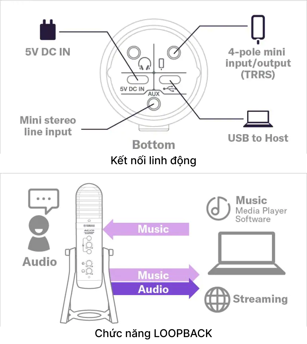 Ngoài ngõ vào âm thanh micro điện dung, AG01 còn được trang bị giắc cắm đầu vào line mini stereo, và giắc cắm mini 4 cực (TRRS) đã được nâng cấp dành cho điện thoại, cho phép cả đầu vào và ra. Bạn cũng có thể thêm âm thanh từ các thiết bị được kết nối qua USB trong chế độ LOOPBACK. Kết hợp với các tính năng trên, kiểu micro này có thể được sử dụng trong nhiều phạm vi phát trực tuyến khác nhau, điều mà trước đây là bất khả thi nếu không có thiết bị trộn riêng biệt.