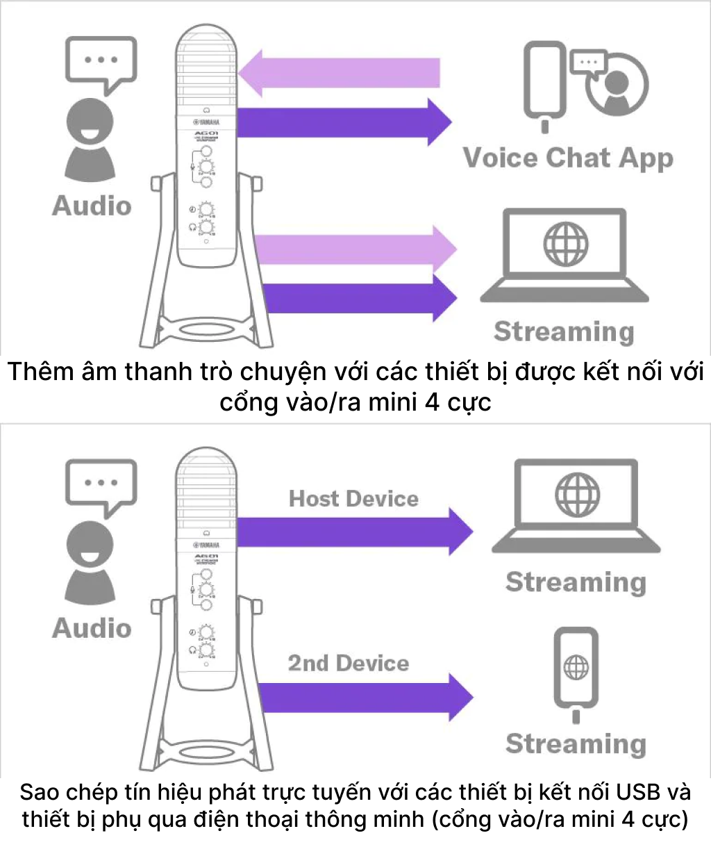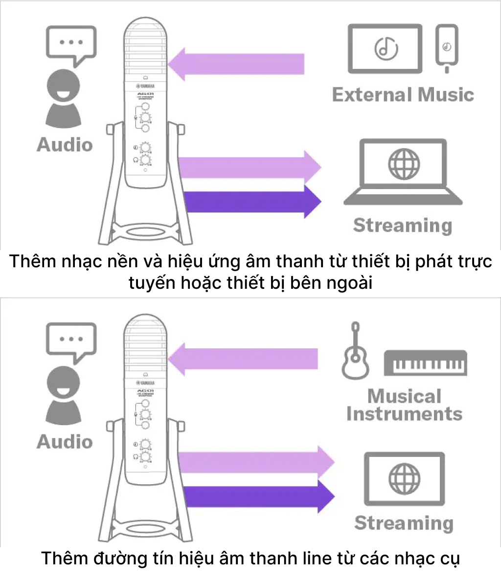Thiết lập cấu hình cho hệ thống phát trực tuyến từ con số 0 có lẽ là một nhiệm vụ khó khăn, nhất là với người dùng có ít hoặc không có kinh nghiệm sản xuất âm nhạc. Micro Yamaha AG01 - Micro USB Livestream Yamaha AG 01 đã tính đến điều này với thiết kế tối giản kết hợp micro condenser chất lượng cao cùng các hiệu ứng DSP, chức năng LOOPBACK, kết nối đầu vào linh hoạt và một bộ trộn đơn giản, trực quan giúp bạn dễ dàng và thoải mái khi phát trực tuyến.