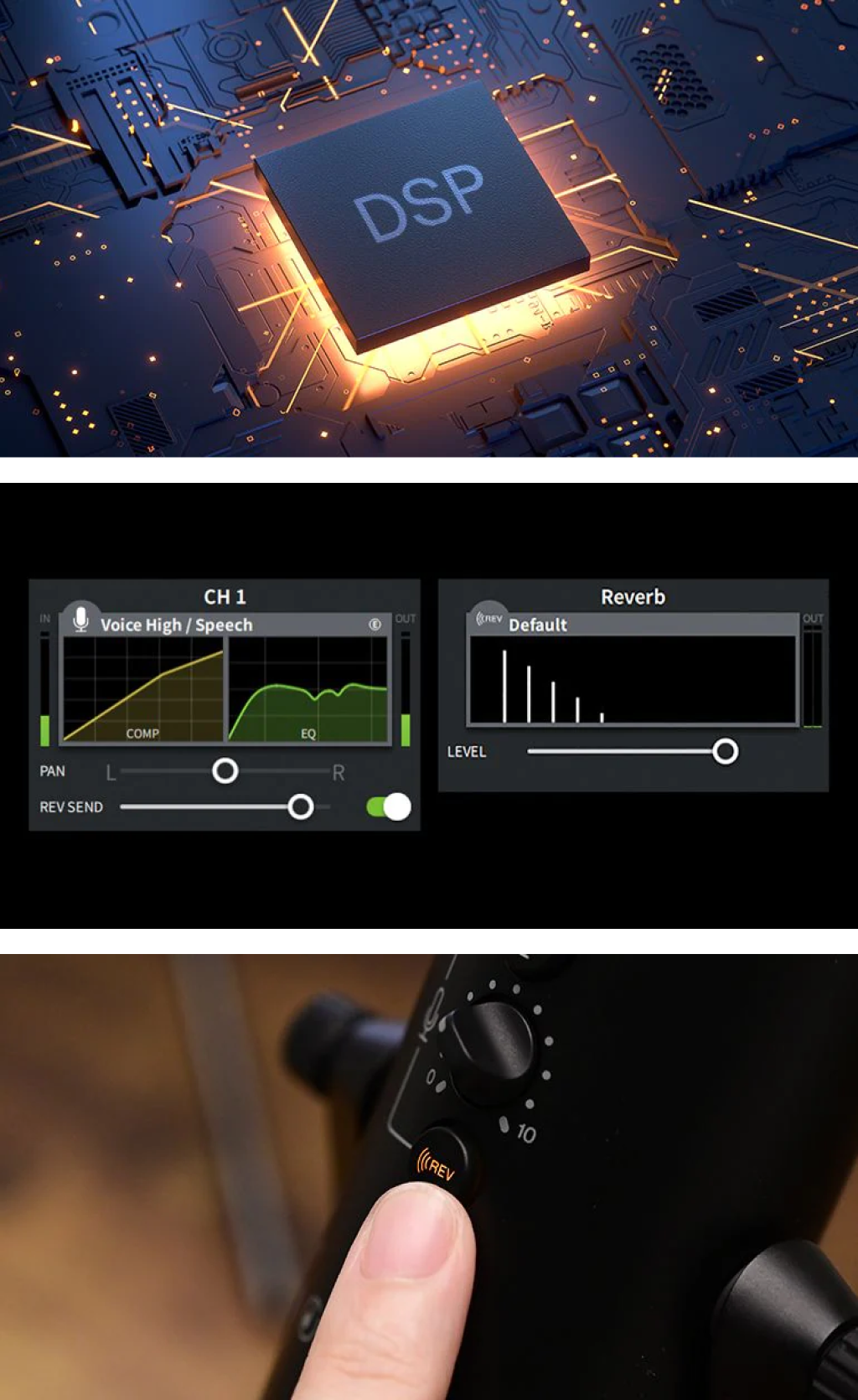 AG01 sở hữu các hiệu ứng DSP chất lượng cao hệt như các mẫu dòng AG khác, cho phép dễ dàng thêm COMP/EQ và REVERB để tô điểm và gọt giũa âm thanh, mang tới chất âm tốt nhất có thể để phát cho khán giả. Cùng với đó, các công cụ trên được xử lý bằng chip DSP tích hợp, bởi vậy không hề có độ trễ, điều này khiến chúng đặc biệt giá trị đối với công việc phát trực tiếp đòi hỏi độ chính xác đến từng thời điểm.