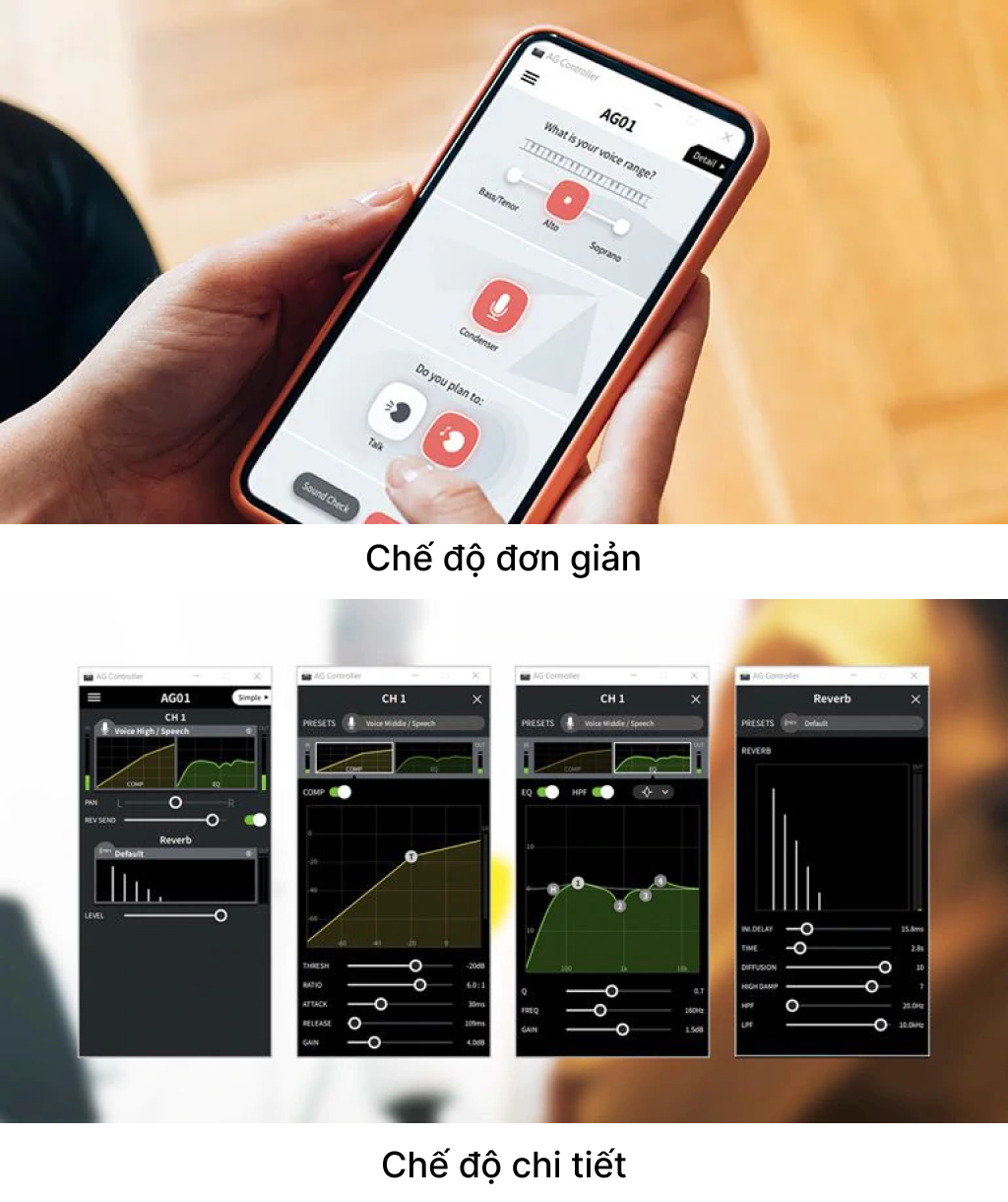 Bạn cũng có thể tắt hoàn toàn các hiệu ứng này để bắt âm mộc, không pha tạp từ micro condenser của AG01 cho việc sản xuất âm nhạc/âm thanh, để kỹ thuật viên có thể chỉnh sửa sau này.