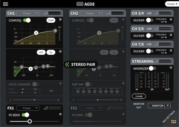 Phần mềm AG08 Controller cho phép người dùng kiểm tra và thiết lập bộ xử lý DSP một cách dễ dàng và chính xác, cũng như gán các nút Sound pads và tùy chọn định tuyến linh hoạt. Với hai chế độ hoạt động là "Simple" và "Detail", AG08 Controller phù hợp cho người dùng ở bất cứ trình độ âm nhạc nào. Người dùng có thể quản lý âm thanh của họ từ thiết bị Windows/Mac hoặc iPadOS kết nối với AG08 qua cổng USB.