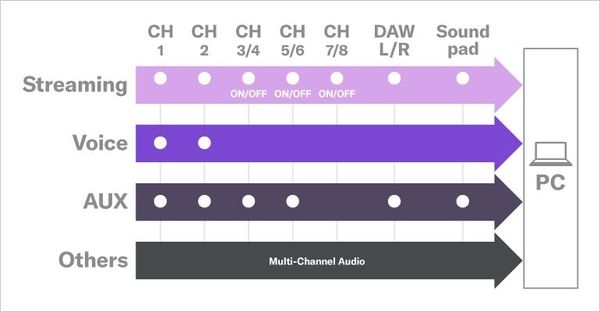 Hơn nữa, đối với các ứng dụng hỗ trợ ASIO như phần mềm DAW, đầu ra trực tiếp từ mỗi kênh đầu vào (Kênh 1, 2, 3/4, 5/6 và 7/8) và ba kênh hỗn hợp có thể được sử dụng song song, cho phép ghi âm đa kênh ngay cả khi phát trực tiếp.