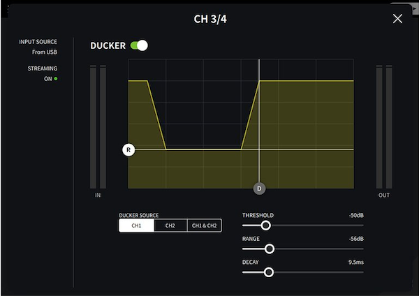 Chức năng Ducker có thể được sử dụng để tự động giảm âm thanh phát lại của Kênh 3/4, 5/6 và 7/8 so với đầu vào âm thanh từ Kênh 1 và 2, vì vậy bạn có thể dễ dàng thiết lập hệ thống phát trực tuyến trong đó tín hiệu Kênh 1 và 2 luôn nghe rõ.