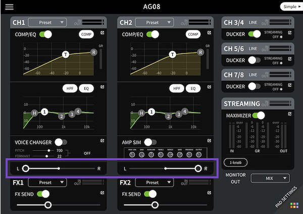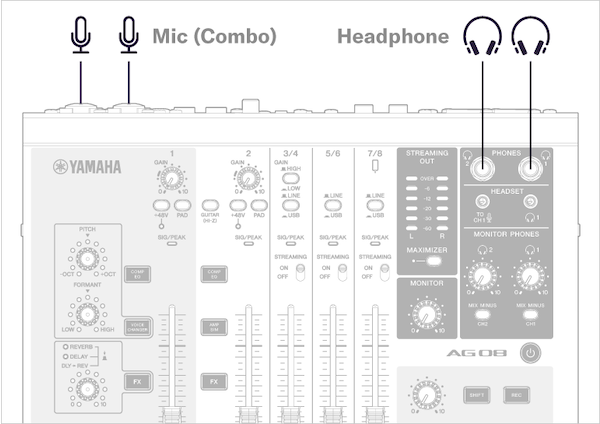 Giống như AG06MK2, cả Kênh 1 và 2 của AG08 đều được trang bị nguồn phantom để hỗ trợ micro condenser được các nhạc sĩ và người sáng tạo nội dung theo hướng đối thoại ưa chuộng vì độ nhạy và độ trung thực đặc biệt của chúng. Bạn cũng có thể xoay trái và phải bằng ứng dụng chuyên dụng AG08 Controller cho bất kỳ loại micro âm thanh nổi nào, kể cả micro ASMR.