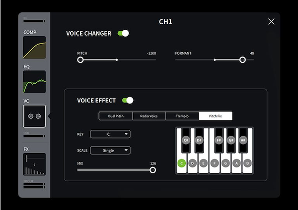 Kênh 1 có hiệu ứng thay đổi giọng nói mới có thể biến đổi giọng nói của bạn thành giọng của giới tính khác, giọng người máy, v.v., trong khi Kênh 2 có trình giả lập bộ khuếch đại để có âm bass hoặc âm guitar khuếch đại chân thực hơn. Những tính năng này, cùng với Comp, EQ, Reverb và Delay mới được thêm vào, có thể được cài đặt độc lập trên từng kênh, cho phép bạn đặt ra cài đặt tối ưu cho từng kênh.